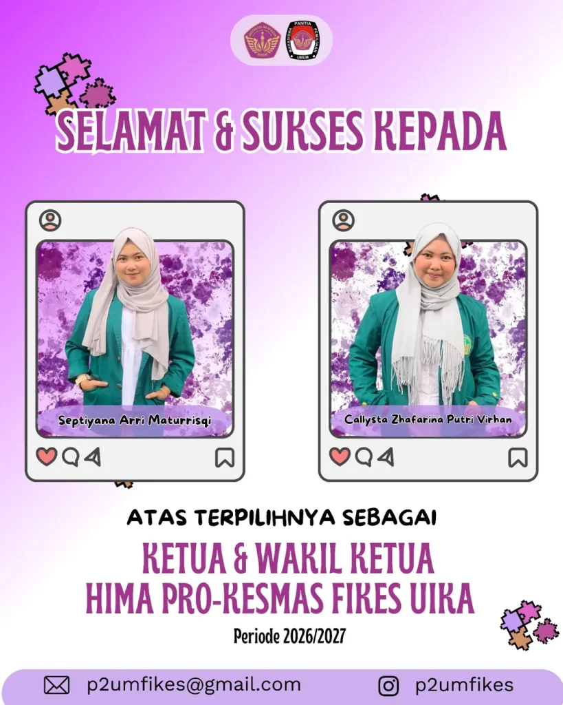Septiyana Arri Maturrisqi dan Callysta Zhafarina Putri Virhan yang telah terpilih sebagai ketua dan wakil ketua HIMA Pro Kesmas Fakultas Ilmu Kesehatan periode 2026-2027.